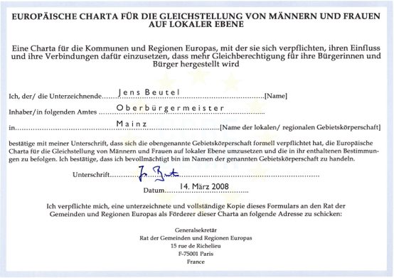 Am 20. Februar 2008 fasste der Mainzer Stadtrat einstimmig den Beschluss, sich der Europäischen Charta für die Gleichstellung von Frauen und Männern auf lokaler Ebene anzuschließen. Durch Unterzeichnung der Charta verpflichtet sich eine Kommune, einen auf zwei Jahre angelegten Gleichstellungsaktionsplan zu erarbeiten und umzusetzen. Die Charta gliedert sich in drei Abschnitte: - Teil I enthält Grundsätze zur Gleichstellung von Frauen und Männern. - Teil II behandelt die Aufstellung eines kommunalen Gleichstellungsaktionsplanes. - Teil III konkretisiert in 30 Artikeln die Bereiche kommunalen Handelns, in denen die Gleichstellung gefördert werden soll.